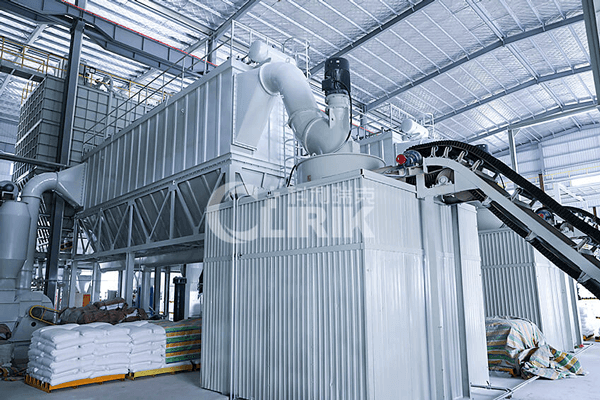 破碎后的小塊膨潤土經(jīng)提升機送至料倉,再經(jīng)振動給料機將其均勻定量的送入磨粉機研磨室內(nèi)進行研磨。